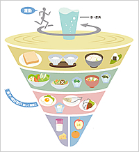 “餐飲平衡表”是2005年6月日本厚生勞動。ㄈ毡菊t(yī)療、勞動部門)與農(nóng)林水產(chǎn)省一起針對飲食生活標(biāo)準采取的具體活動之一。“餐飲平衡表”中分為主食、主菜、配菜,按照相應(yīng)的比例體現(xiàn)在圖表中。讓人們可以清楚的看到“吃什么”“吃多少”。